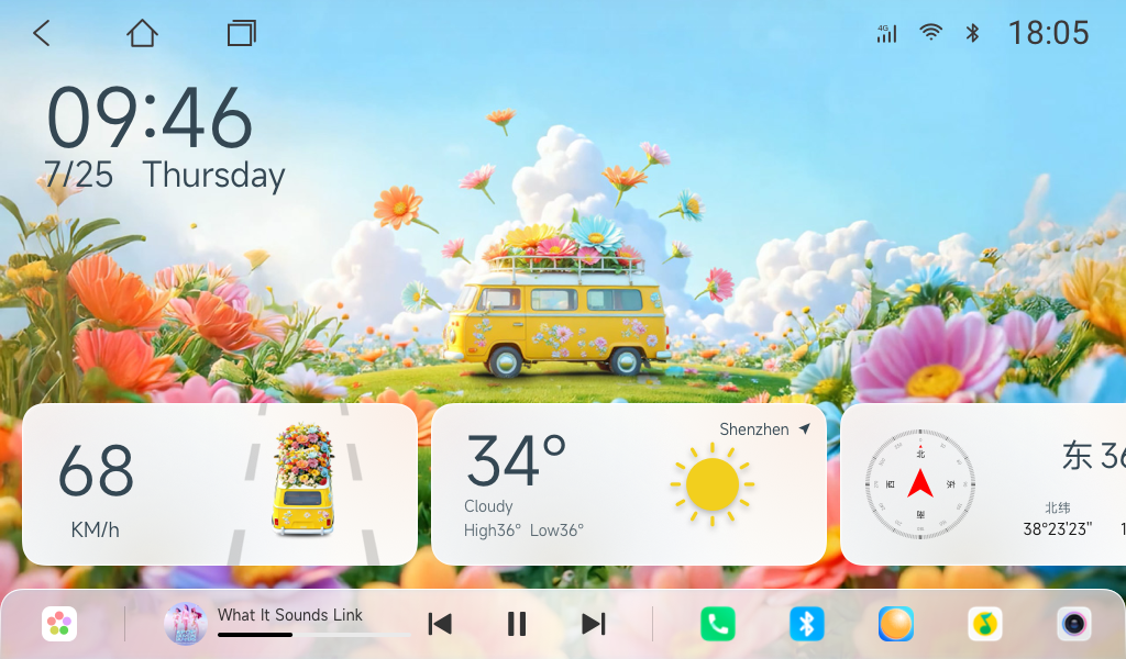 功能介绍:背景动效与车速链接,每一步都是花海!同时支持昼夜模式。底部功能可以滑动,也可自定义排序,点击底部的媒体歌名,桌面即可悬浮歌词!