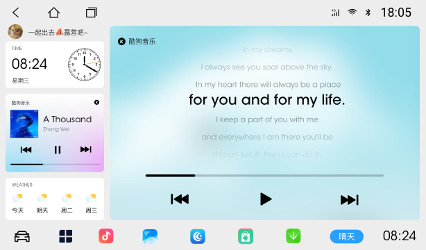 通勤路上,用多组件分屏把导航、音乐、天气、时间一网打尽,高效不分心,兜风时刻,切换全屏歌词界面,让旋律和窗外的风一起包裹你。 分辨率 1024x600 普通版